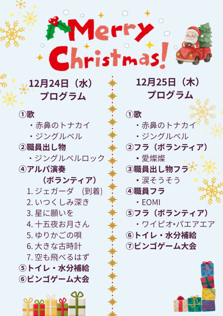2025年クリスマス会のお知らせ|レベルアップケア(大田区中央) 投稿者:levelup-care 投稿公開日:2025年12月6日 投稿カテゴリー:未分類 おすすめ レベルアップケア通信10月号 2025年10月4日 レベルアップケア通信8月号 2025年8月18日 2024年11月号 レベルアップケア通信 2025年1月16日
